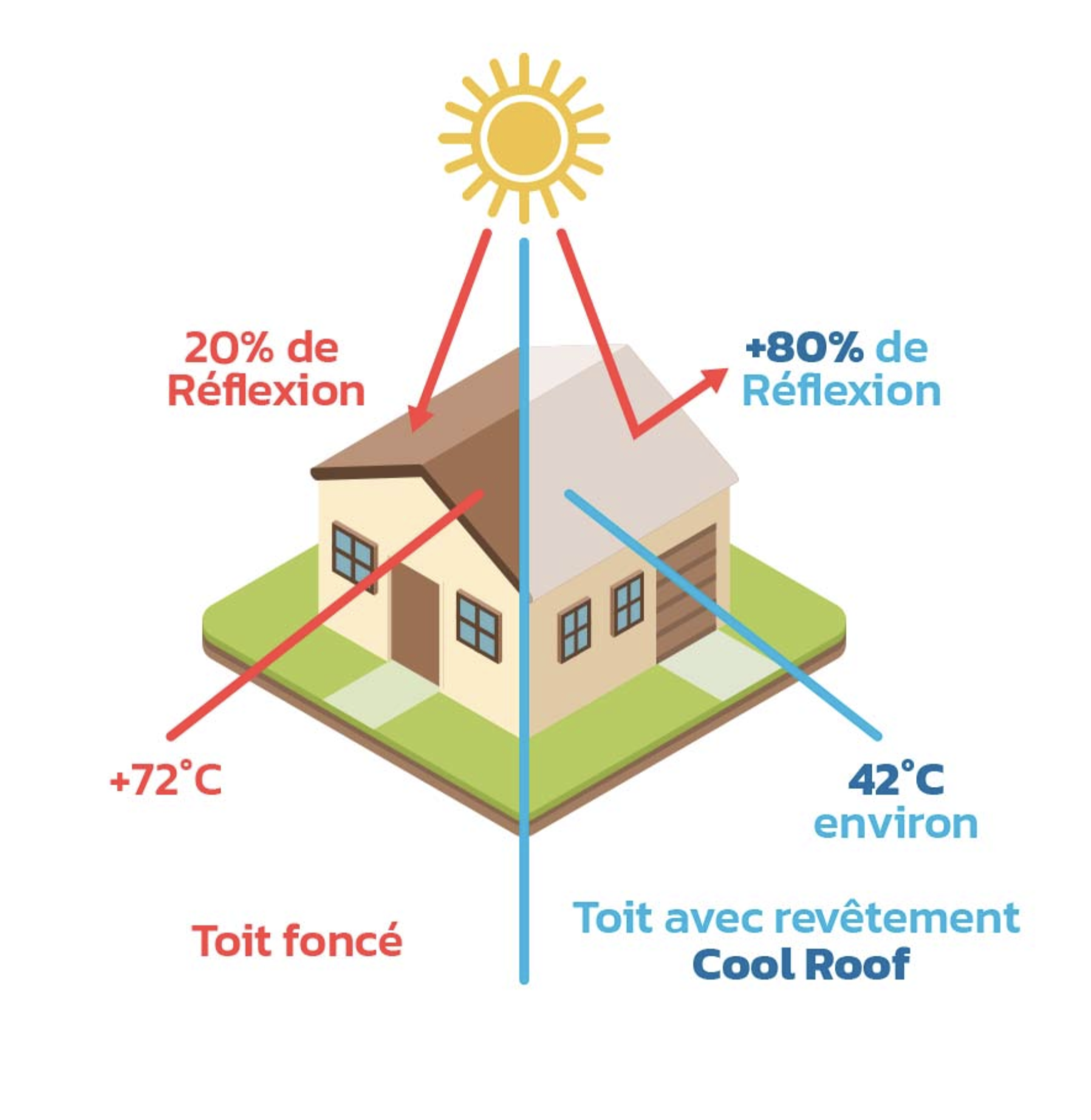 Lorsqu’un toit est exposé au soleil, une partie du rayonnement est réfléchie tandis qu’une autre est absorbée par le matériau. Sur les toitures sombres, la majorité de cette énergie est absorbée, ce qui peut faire monter la température de surface jusqu’à 70–80°C et transmettre la chaleur à l’intérieur du bâtiment.